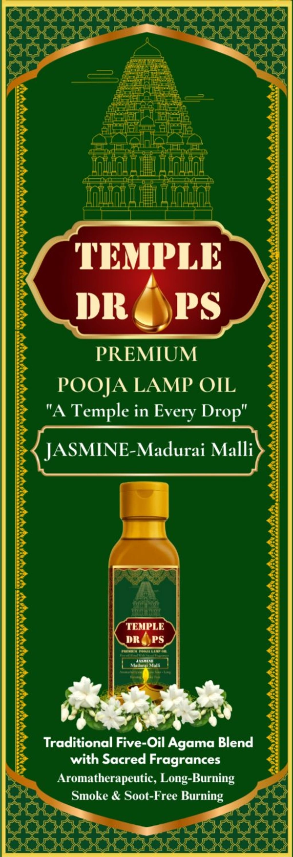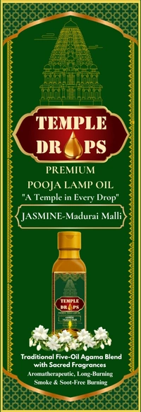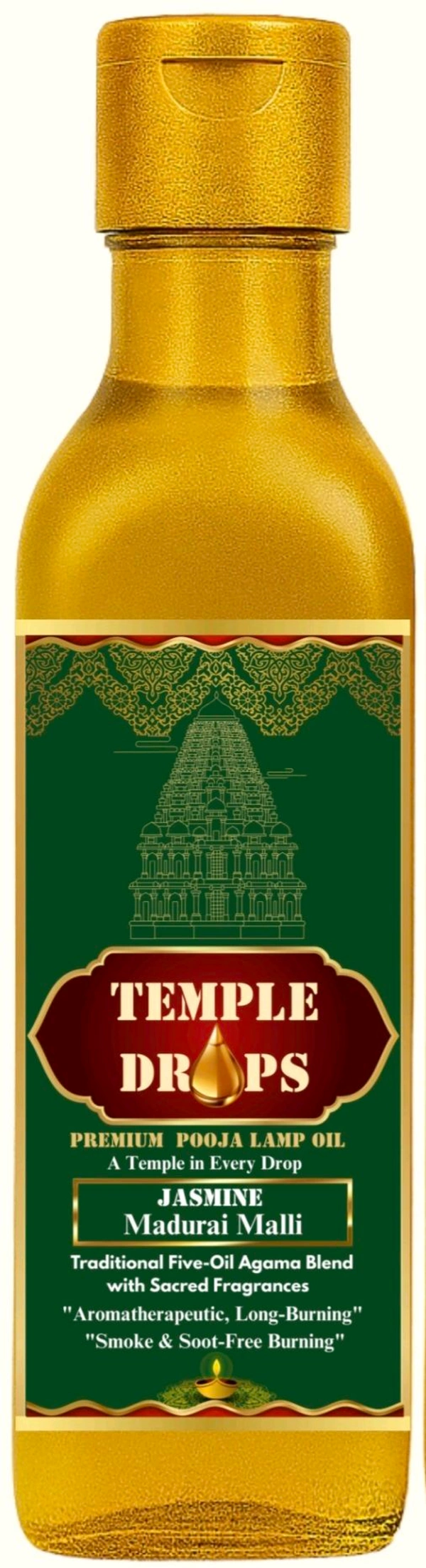 TEMPLE DROPS POOJA LAMP OIL 500Ml ML, JASMINE- Madurai Malli. Traditional Five-Oil Agama Blend with Sacred Fragrances "Aromatherapeutic, Long-Burning" "Smoke & Soot-Free Burning
