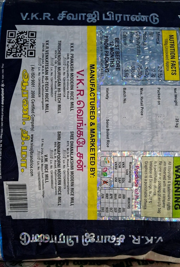 V.R.K SIVAJI RICE 25KG Sona Boiled Rice